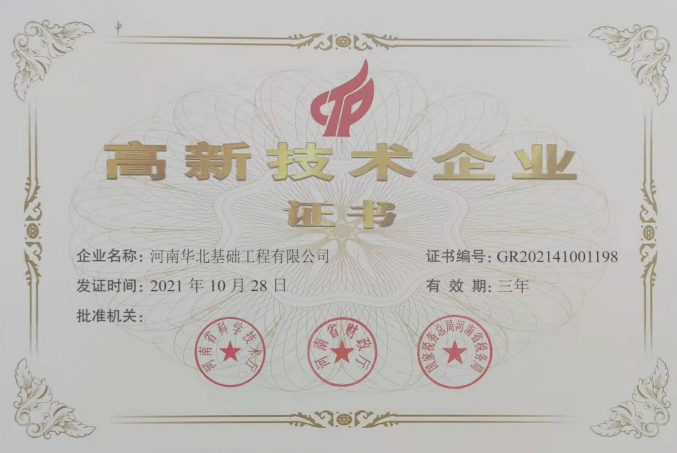 2021年12月28日,河南省科學(xué)技術(shù)廳正式為河南華北基礎(chǔ)工程有限公司頒發(fā)了《高新技術(shù)企業(yè)證書》,這既是對(duì)河南華北基礎(chǔ)工程有限公司公司核心技術(shù)的認(rèn)可,也是對(duì)科技成果轉(zhuǎn)化的肯定,在公司“技術(shù)引領(lǐng)、創(chuàng)新發(fā)展”中,具有里程碑的意義。