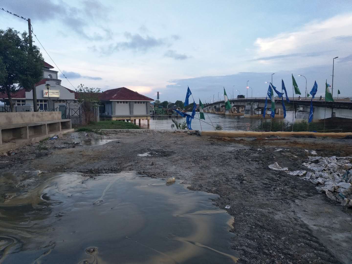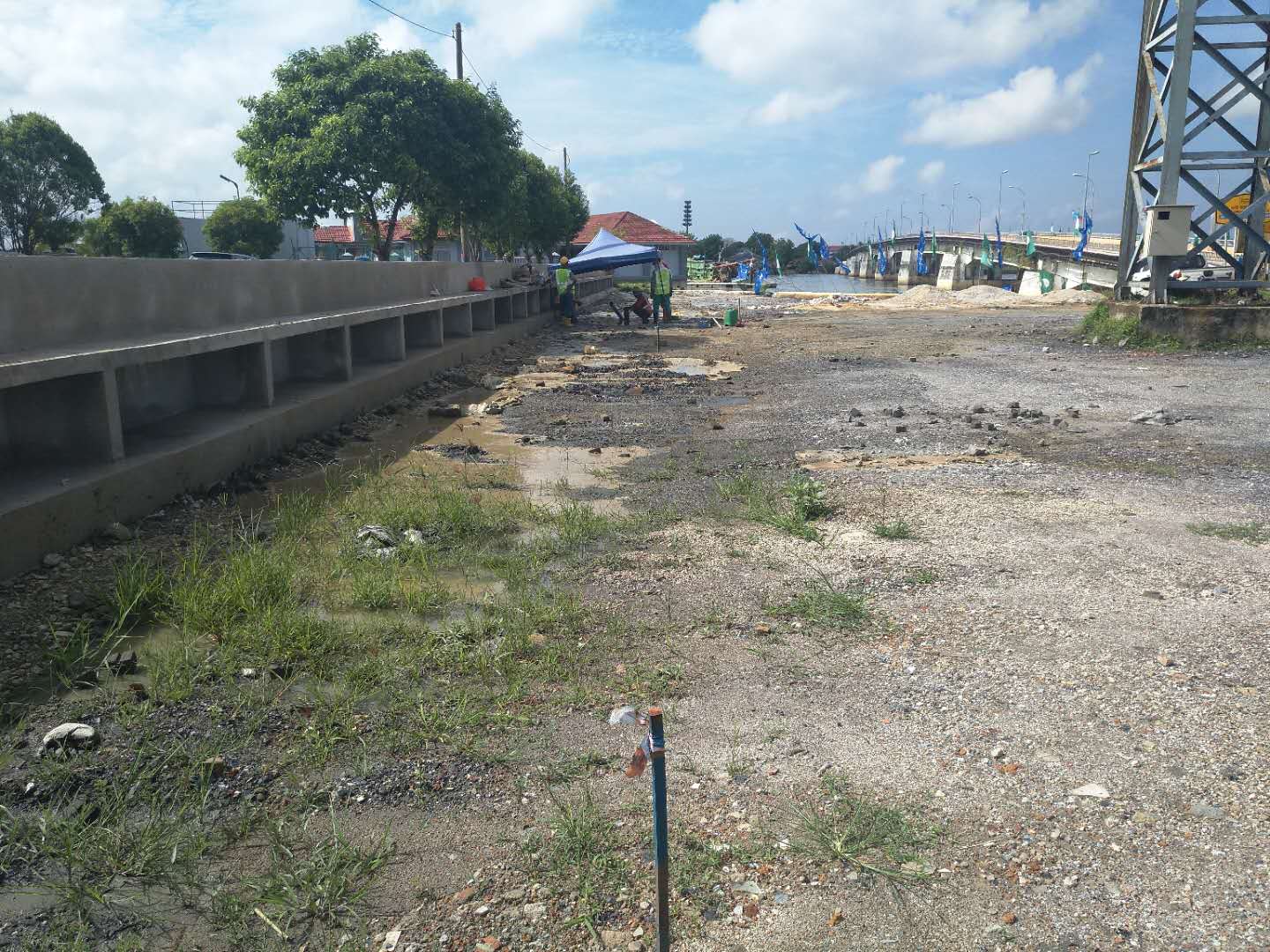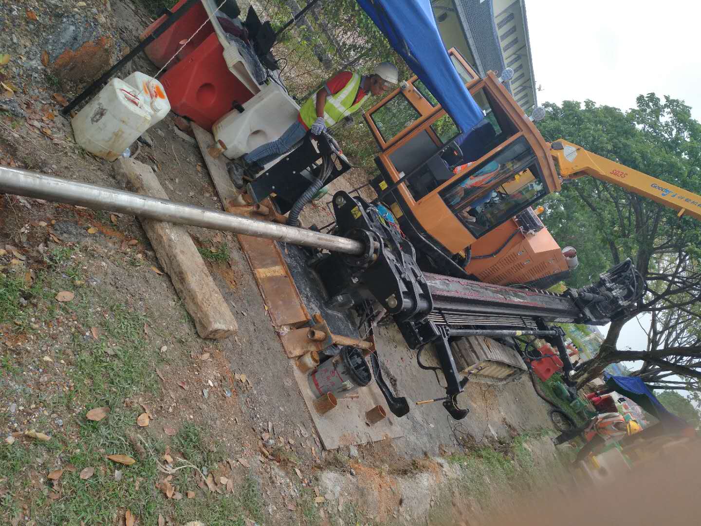 這次穿越鉆機(jī)受限制,只能固定在一個(gè)地方,旁邊是給船加油的油廠,穿越差不多平行橋走,距離橋10米距離,處鉆口也很受限制,出鉆口有停車場,有人工管網(wǎng)。